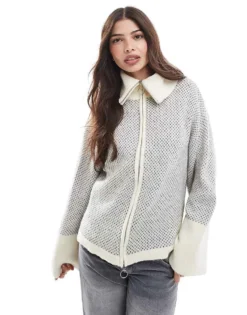 Pieces Jacquard Zip Through Cardigan With Wide Sleeves In Cream And Grey Mix For Women Birch