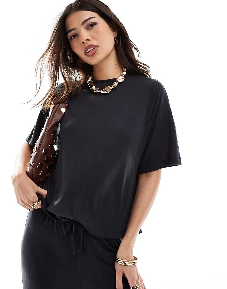 Pieces Slinky Super Soft Boxy T-shirt And Wide Leg Trouser Co-ord In Black