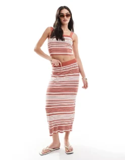 Pieces Super Soft Knitted Crop Top And Maxi Skirt Co-ord In Brick Stripe